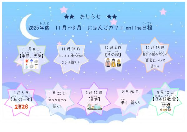 11/20、12/18、1/22、2/26は 会話の 練習をします。たくさん 話しを する日です。